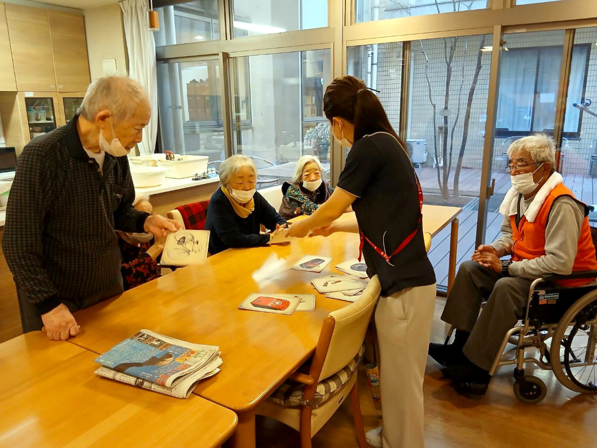 笑い声につられて覗くと、昔の自転車や水鉄砲、湯たんぽなどのカードを囲んで思い出話が大盛り上がり。「昔、女房と自転車でね…」と素敵なエピソードが次々と飛び出し、職員も交えて皆さんがいつまでも楽しそうに話していました。